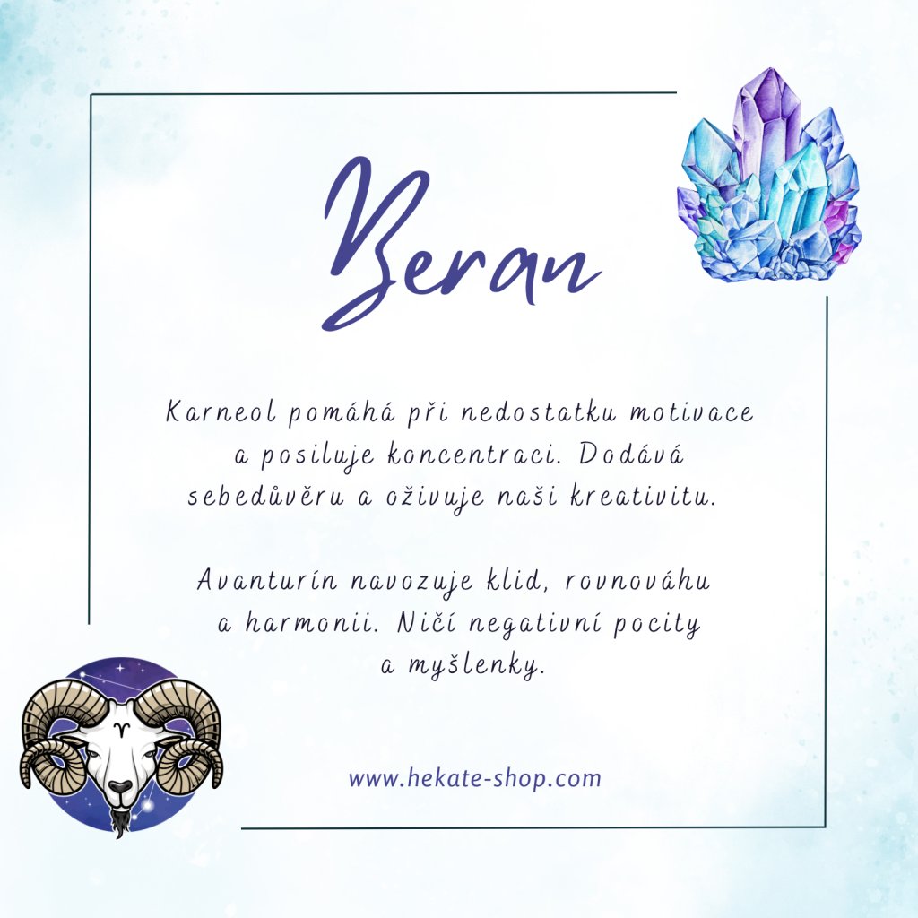 Karneol pomáhá při nedostatku motivace a posiluje koncentraci. Dodává sebedůvěru a oživuje naši kreativitu. Avanturín navozuje klid, rovnováhu a harmonii. Ničí negativní pocity a myšlenky.