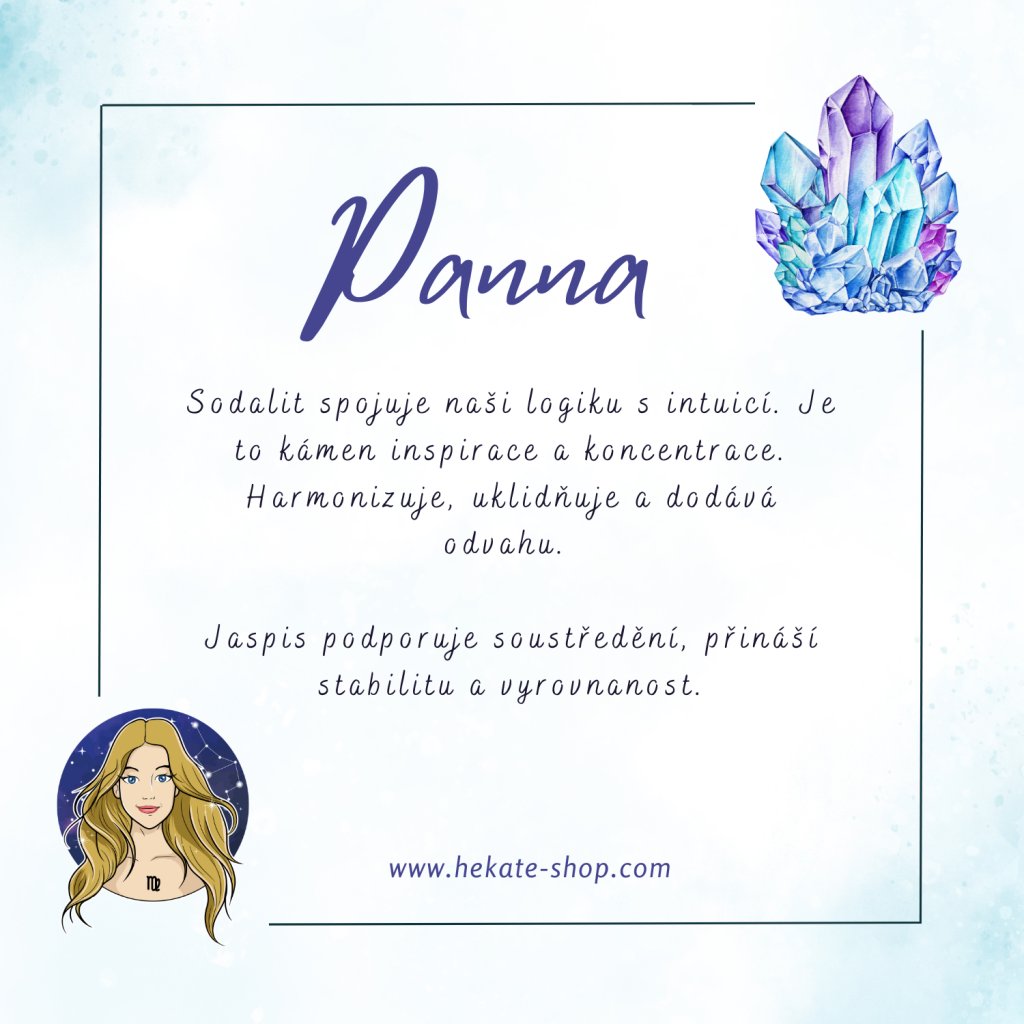 Sodalit spojuje naši logiku s intuicí. Je to kámen inspirace a koncentrace. Harmonizuje, uklidňuje a dodává odvahu. Jaspis podporuje soustředění, přináší stabilitu a vyrovnanost.